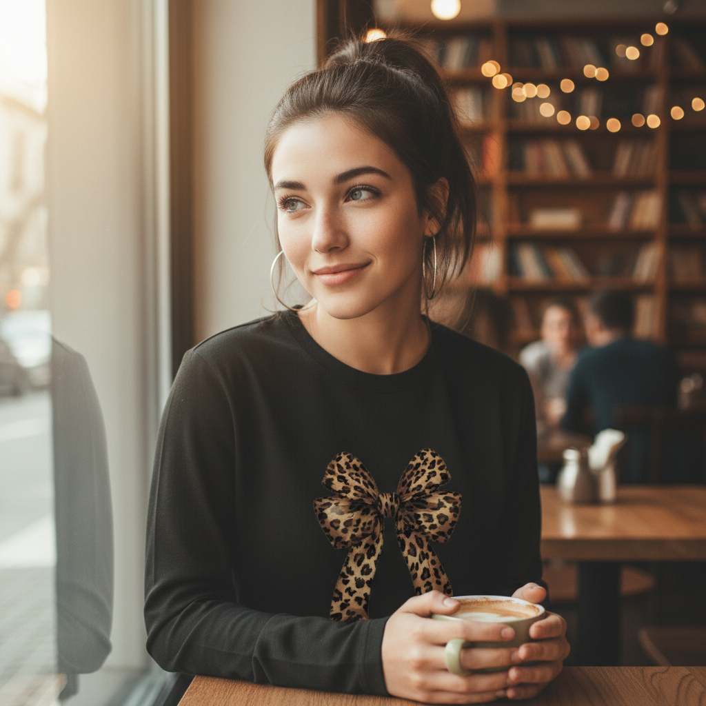 Make a fierce fashion statement with this stylish leopard bow graphic tee that perfectly blends feminine charm with wild edge. Featuring a bold leopard print bow design, this versatile top adds instant personality to your wardrobe. Available in classic white short sleeve and sophisticated black long sleeve, both versions showcase the eye-catching animal print bow that brings a trendy twist to any outfit.