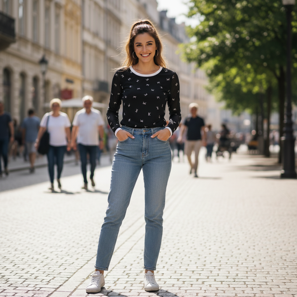Style Tip: The cream and beige versions create soft, neutral looks that pair beautifully with light or medium wash jeans for a cohesive, casual-chic vibe. The black version with white bows offers striking contrast—pair it with any wash of denim for a bold yet balanced look. The grey with blue trim brings a modern color-block element that works wonderfully with both blue denim and neutral bottoms. All versions look great tucked into high-waisted jeans or worn loose with your favorite pants. Layer under denim jackets or cardigans for cooler weather, add simple sneakers or ankle boots, and you’re ready for any casual occasion with effortless style!