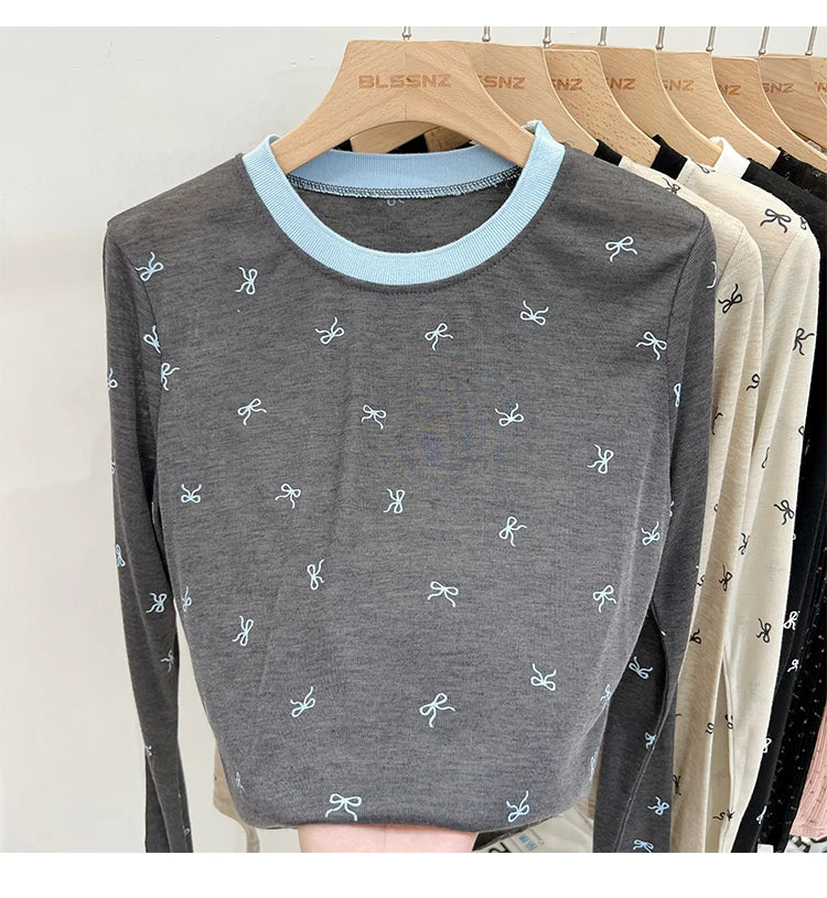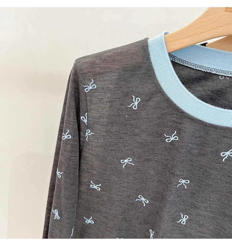 Crafted from soft, comfortable fabric with a classic crew neck and long sleeves, this casual top is perfect for everyday wear. The contrasting trim at the neckline and cuffs adds visual interest and structure, while the all-over bow print creates a cohesive, playful aesthetic. The relaxed fit ensures comfort without sacrificing style, making it easy to wear from morning coffee to evening activities.