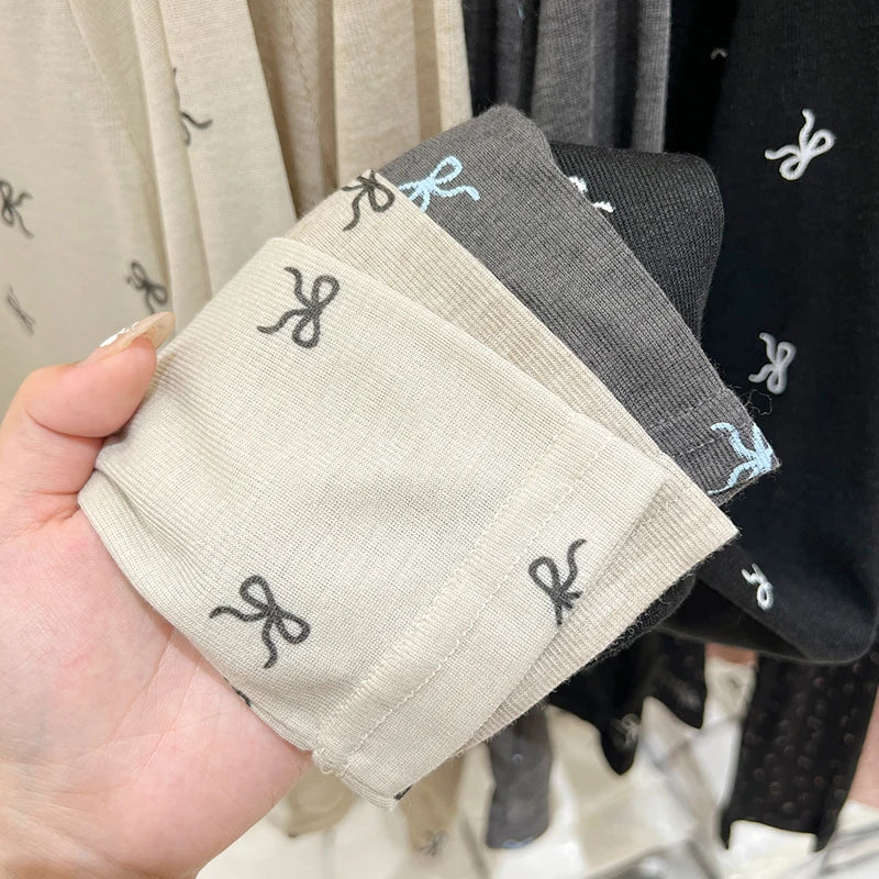 Bring playful charm to your everyday wardrobe with this adorable all-over bow print long sleeve top that adds personality to casual dressing. Featuring a scattered bow pattern across the entire garment, this versatile shirt brings sweet style without being too cutesy. Available in cream with black bows, beige with black bows and contrasting black trim, classic black with white bows and trim, and grey with white bows and contrasting blue trim, each colorway offers its own unique take on this charming pattern.