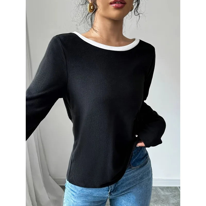 Elevate your wardrobe essentials with this sophisticated long sleeve top that’s anything but basic. The classic black base is beautifully accented with crisp white contrast trim along the neckline, creating a timeless look that never goes out of style. But the real showstopper? Turn around to reveal an elegant open back design adorned with two charming white ribbon bows that add a playful yet refined touch.